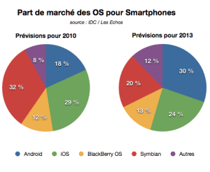 D’après la dernière étude d’IDC, il devrait se vendre davantage de smartphones équipés d’Android que d’iPhone en 2011. Si Apple est en tête dans l’hexagone actuellement (29% des ventes cette année versus 18% pour Android), en 2011 Android serait attendu avec une part de marché de 29 %, contre 26 % pour l’iPhone. C’est déjà le cas, ce mois-ci, avec les ventes du Galaxy S qui seraient supérieures à celles de l’iPhone…