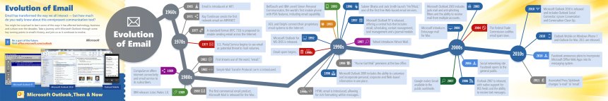 Microsoft vient de publier une belle infographie sur l’évolution de l’email et d’Outlook en particulier. De quoi rappeler pour l’éditeur qu’il est aussi à l’origine de la messagerie « dans le cloud » gratuite avec le rachat de Hotmail et que son grand concurrent Gmail est arrivé bien plus tard ouvert à tous…