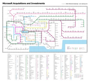 Chaque ligne est une branche technologique (WebServices, Search, Telecom,…), les stations sont les différents investissements ou acquisitions réalisés par l’éditeur avec, lorsque les informations sont publiques, le montant dépensé, ainsi qu’un jeu de couleurs pour désigner l’année de réalisation. Une vue assez complexe en fait mais visiblement assez exhaustive, un travail colossal en tout cas !