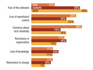 Le rapport de cette étude propose de nombreux graphiques pour positionner les attentes, les craintes, les bénéfices constatés, pour les entreprises privées ou les organisations publiques. Ainsi le graphique ci contre positionne les principales craintes des organisation interrogées concernant le cloud computing. Selon les continents, ces craintes varient de façon importante.