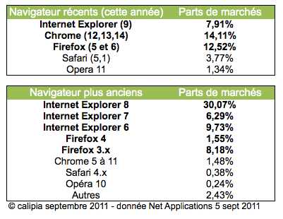 En reprenant les chiffres de Net Applications, nous avons regroupé les différentes versions des navigateurs en fonction de leurs dates de disponibilités respectives. Le regroupement pour les versions de navigateurs rendues disponibles en 2011 donne les résultats suivants (à comparer au 8% d’Internet Explorer 9) : 14% pour les versions 2011 de Chrome, le navigateur de Google, 12,5% toujours pour les versions 2011 de Firefox. Là où Internet Explorer tire son épingle du jeu c’est bien sûr sur les anciennes versions : 30 % pour Internet Explorer 8, 6% pour la version 7 et 10% pour Internet Explorer 6, un navigateur vieux maintenant de 10 ans !