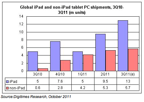 Selon les derniers chiffres de Digitimes Research (octobre 2011) les ventes d’iPad sont toujours au beau fixe, et la concurrence Android et autres peine toujours à progresser. Mieux, Apple regagnerait des parts de marché (déjà écrasantes) au 3ème trimestre 2011, face pourtant à une concurrence multiple. Visiblement Google ne parvient pas (encore) avec Android sur les tablettes à reproduire le succès des téléphones sous ce même système. Il faut dire aussi que le prix de ces dernières est nettement moins différentiant …