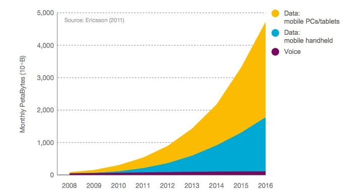 Ericsson vient de livrer ses prévisions d’évolution du trafic des communications mobiles. D’ici 2016 le volume échangé devrait-être multiplié par 10. Ce n’est pas une surprise, la voix devrait être stable, la croissance sur les données coté Smartphone et encore plus coté Tablette et PC (Carte 3G), sera très importante.