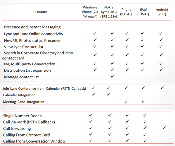 Lync pour iPhone, iPad, Windows Phone, Symbian et Android arriverait dès lundi sur les différentes places de marchés d’Apple, Microsoft et Android. Nous vous l’annoncions ici même pour décembre il y a quelques mois, celà se confirme. Vous trouverez ci-dessous un tableau résumant les différences entre versions.