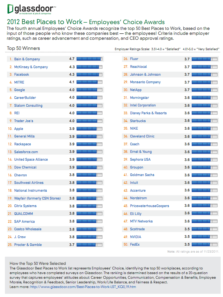 Depuis 4 ans Glassdoor publie ses enquêtes sur les entreprises US où il fait bon travailler. Sans surprise, Facebook, Google et Apple sont dans le top 10…