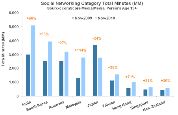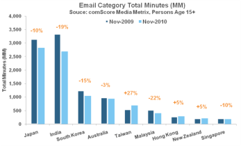 Ainsi sur la région Asie-Pacifique, les 2 graphiques illustrent les tendances inversées entre usages webmail et usages réseaux sociaux :