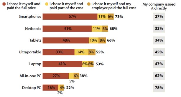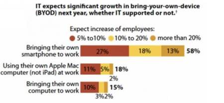 Inversement, les managers IT de leur côté voient encore les programmes BYOPC comme assez minoritaires, avec seulement 6% d’entreprises offrant de tels programmes en 2011, soit un doublement par rapport à 2010.