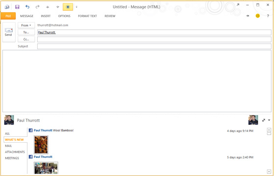 tout est maintenant intégré directement dans la gestion de compte. Et donc sans surprise on retrouve une fois ceci configuré, l’actualité de ses contacts dans la zone en bas du message ou du rendez-vous.