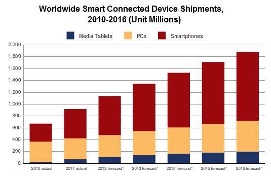 Ainsi pour IDC, dès 2016 les parts de marché des PC tomberaient à 25,1% (pour 35,9% en 2011), alors que les appareils fonctionnant sous Android sur architecture ARM (aussi bien smartphones que tablettes) passeraient de 24,9% à 31,1% pour la même période.