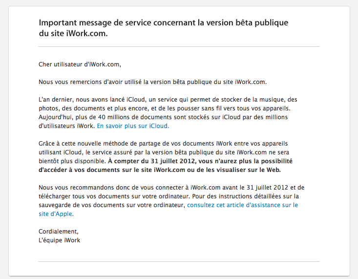 La société comptait sans doute lancer il y a deux ans une suite bureautique en ligne : iWork.com. C’est désormais de l’histoire ancienne. Le constructeur propose maintenant à chaque client en beta (ce qui était notre cas à des fins de test) de récupérer ses documents avant la fermeture de ce site le 31 juillet…