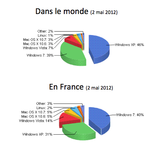 Pour rappel l’année dernière (mai 2011) Windows 7 et Windows XP étaient à égalité à 33% chacun en France.