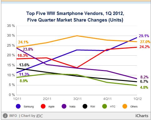 Selon IDC, Samsung a vu ses parts de marchés quasiment tripler sur un an (de 11,3% à 29,1%), pendant que dans le même temps, Apple passait de 18,3% à 24,2%, soit une croissance de « seulement » 32% de ses propres parts de marché. Les suivants (HTC, Nokia ou RIM) se trouvent tous loin derrière, entre 4 et 8%.