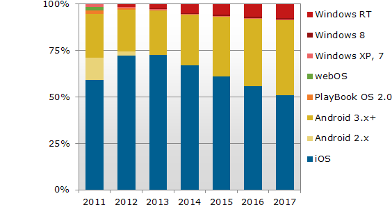 C’est NPD DisplaySearch qui ouvre le bal avec cette étude comparant les systèmes d’exploitation des tablettes de 2011 à 2017.