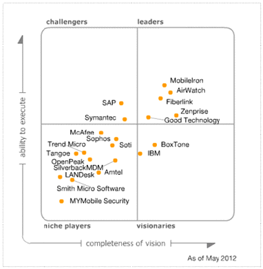 Sans surprise le nouveau Magic Quadrant commence à opérer une consolidation de différents acteurs. les grands du secteur (nous l’avons encore vu récemment avec le rachat d’Odyssey Software par Symantec) rachetant les plus petits. On remarque également l’arrivé d’IBM dans ce classement. Une absence marquée : celle de Microsoft, il est vrai que System Center 2012, n’est pas à la hauteur de ces concurrents en la matière, l’administration proposée des mobiles y compris dans la dernière version étant très minimale y compris pour les périphériques Microsoft…