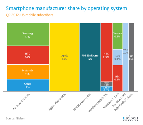 Nielsen vient de publier sa dernière étude sur les parts de marché des Smartphones aux US : sans surprise Android et iOS se taillent la part du lion à respectivement 51 et 34% laissant loin dernière leurs concurrents en forte régression d’une année sur l’autre. Les choses sont encore plus tranchées si l’on regarde (figure de droite) les achats du dernier trimestre où la forte baisse du Blackberry s’accélère.
