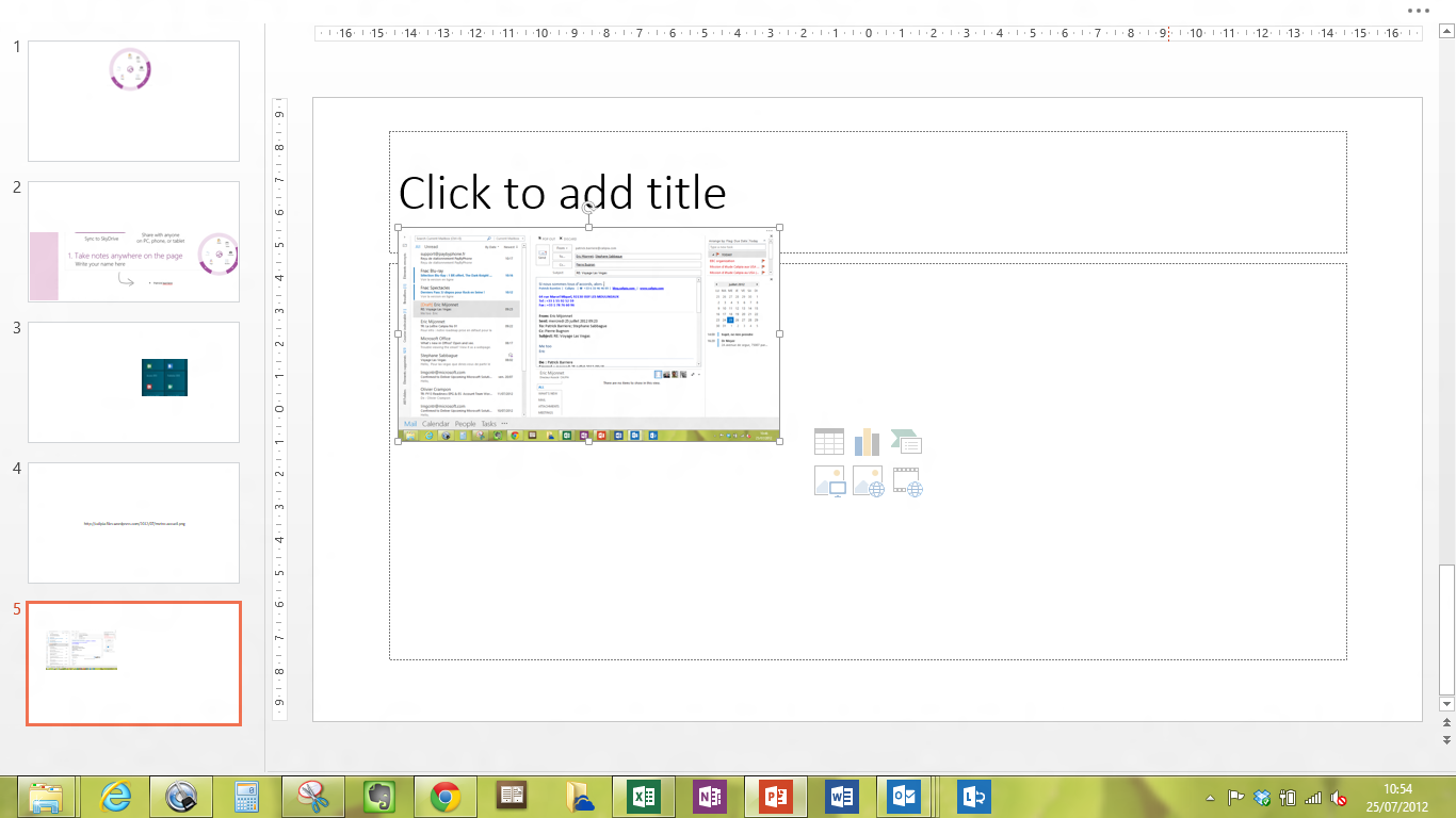 Bien entendu, je me suis empressé de souscrire à Office 365 Pro Plus, à partir de mon PC, un ASUS Core i5, avec 4 GO de RAM, sans écran tactile, et avec un touchpad ridicule (petite taille, mono touch), sous la dernière preview de Windows 8 (nous sommes un peu joueurs :)). Seule concession au multi touch, j’ai acheté la dernière souris Microsoft multi touch, qui permet ainsi de pouvoir exprimer quelques gestes à un, deux ou trois doigts.  De plus, ce portable est connecté à un second écran externe.