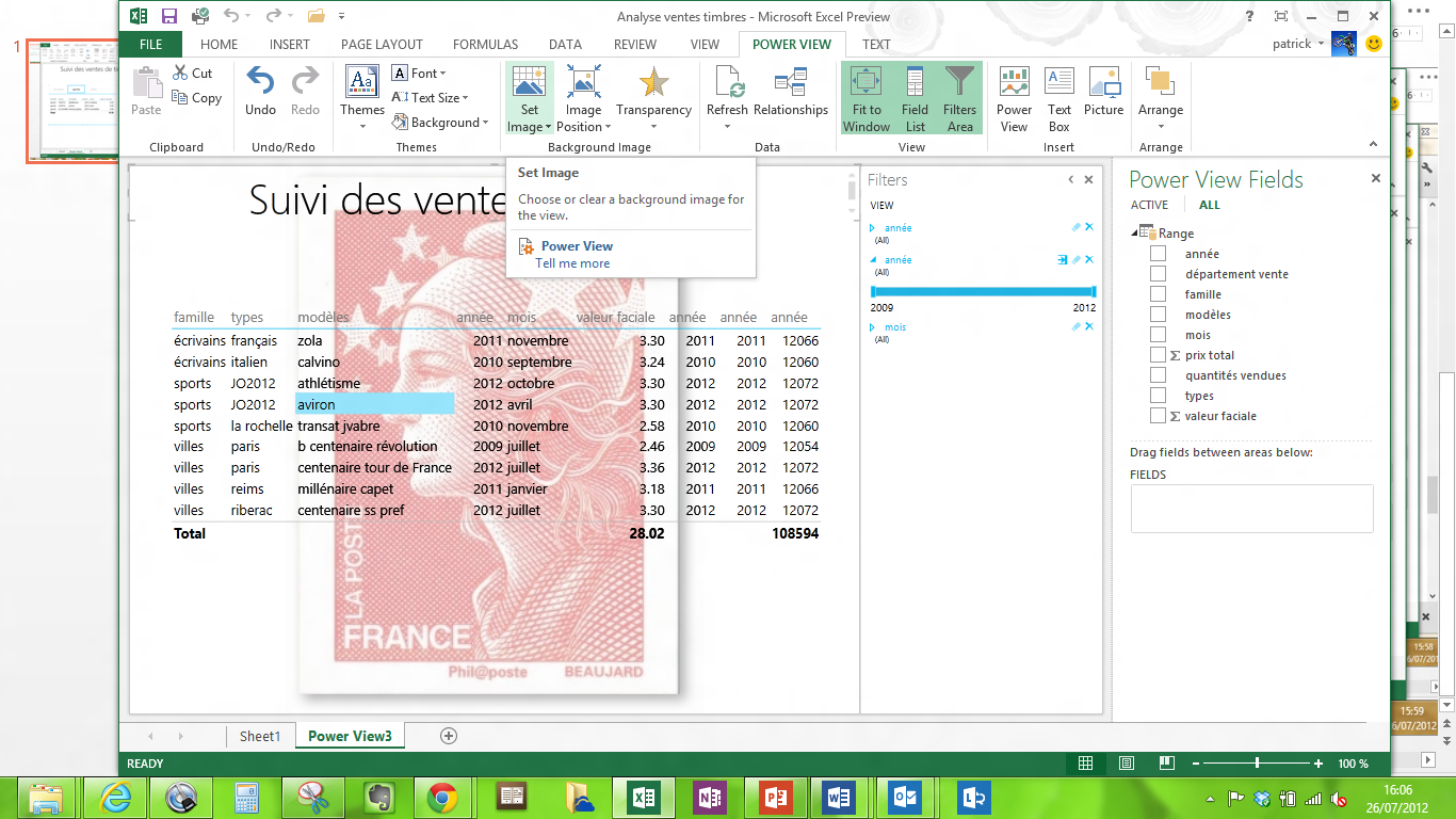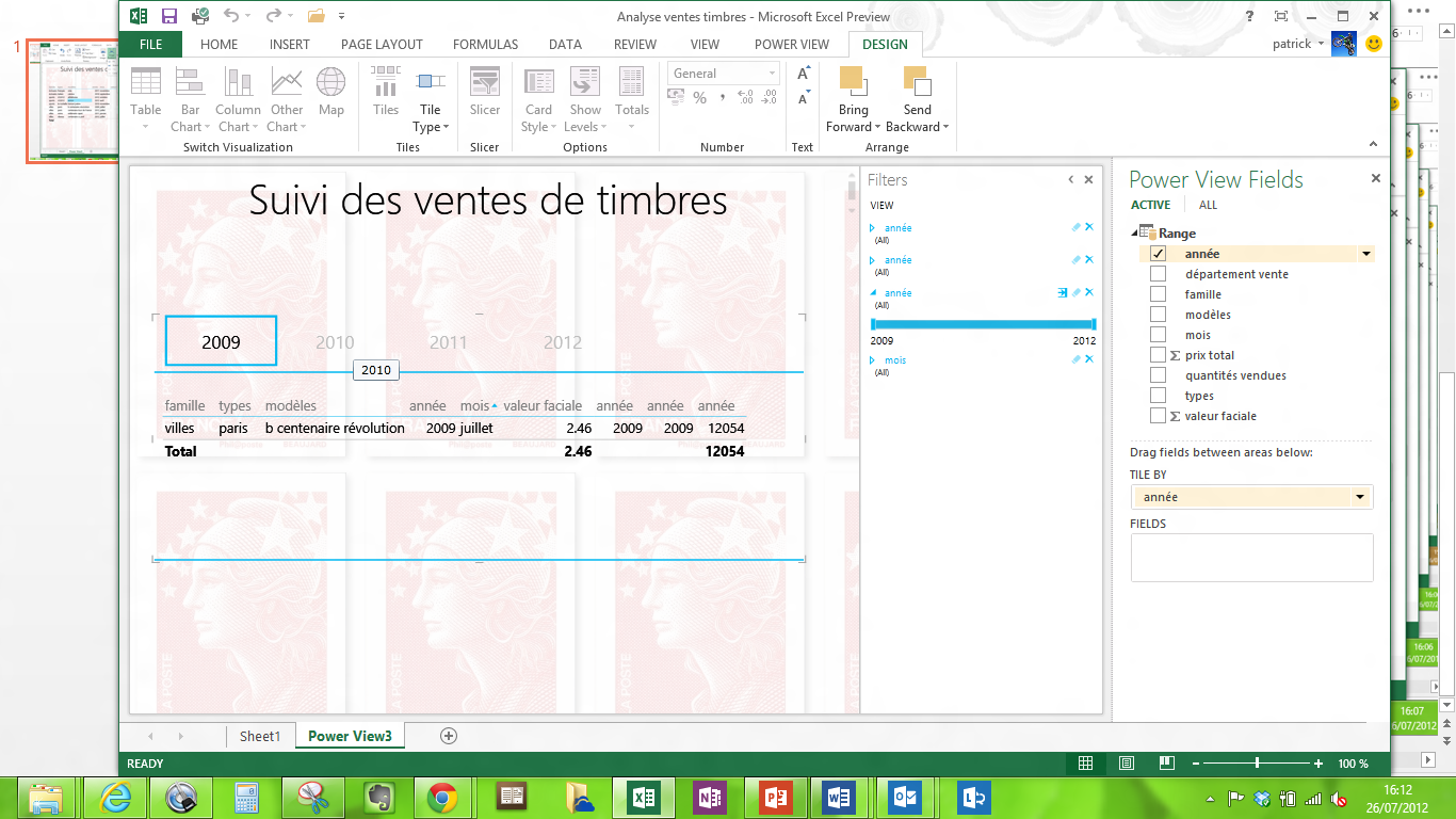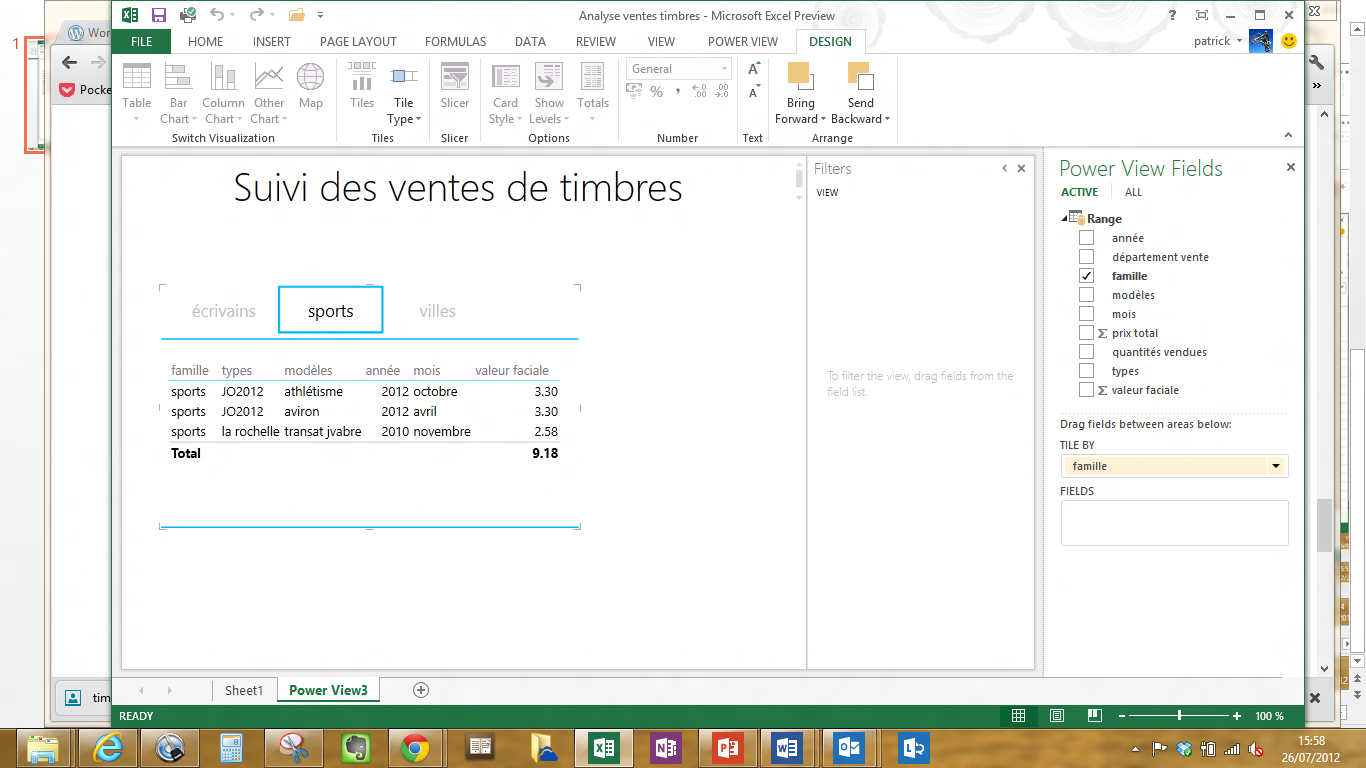 La fonction PowerView permet à l’utilisateur final de construire des rapports dynamiques sur la base de fichiers Excel, tableaux croisés dynamiques, tables PowerPivot … Cette fonction PowerView est un peu aux rapports ce que la fonction PowerPivot (tableau croisé dynamique) est aux tableaux de chiffres. L’utilisateur peut créer des rapports intégrant des tableaux de chiffres, des graphiques, des titres, du texte explicatif, avec une dimension temporelle. Ces rapports sont liés aux données et donc dynamiques.