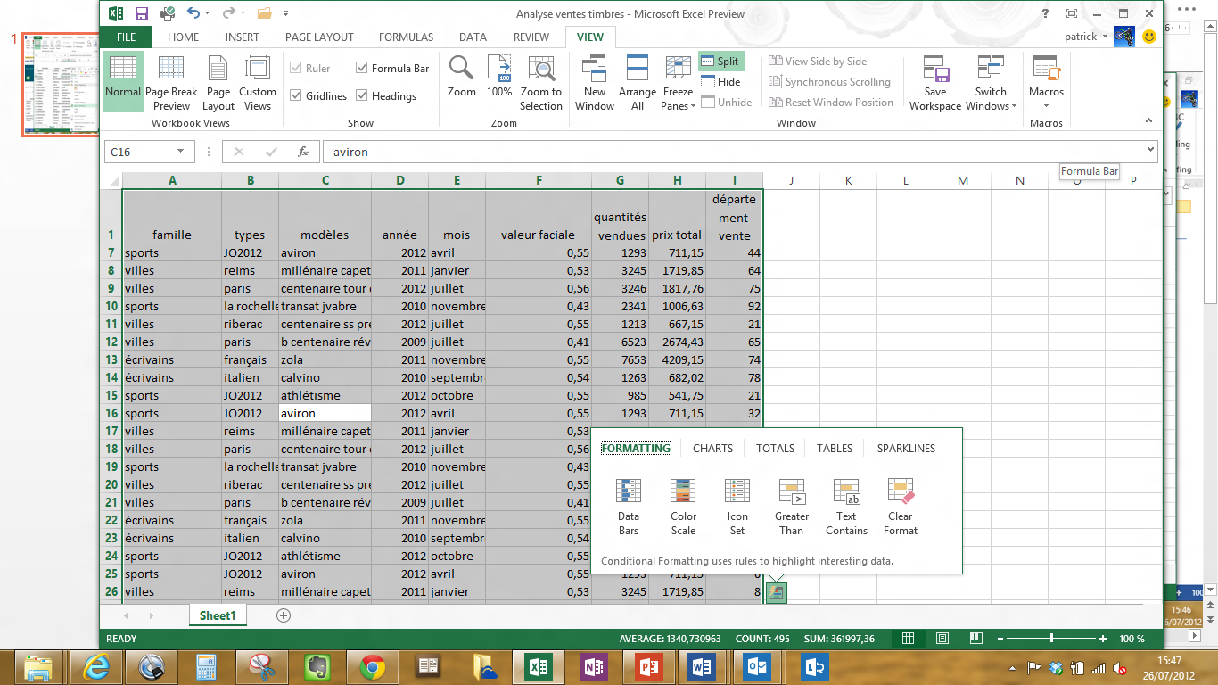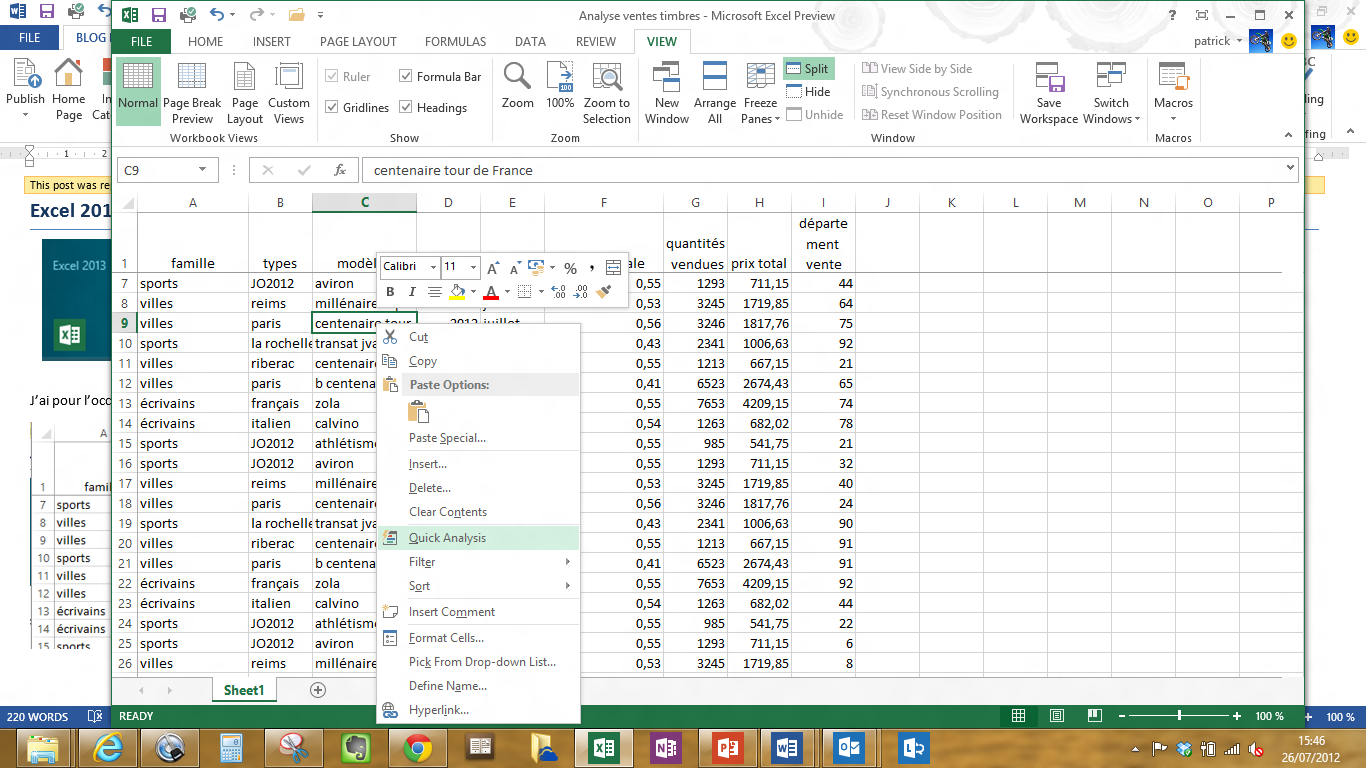 il s’agit d’une nouveauté très intéressante et qui permet de présenter aux utilisateurs en un clic de souris (clic droit sur le tableau de chiffres à analyser), les différentes options qui lui sont proposées (tableaux croisés dynamiques, formatage conditionnel, les graphiques, insertions de sous totaux, graphiques sparklines …). Outre l’aspect synthétique de la présentation des choix possibles, il faut aussi noter la prévisualisation qui est faite, permettant ainsi à l’utilisateur de voir le résultat qu’il obtiendra avant de faire le choix effectif, s’évitant ainsi des Undo/annulation. Cette prévisualisation va même jusqu’à proposer des tableaux croisés dynamiques tout fait aux utilisateurs (qui conservent la liberté de construire les leurs bien entendu), évitant à ceux qui ne sont pas familiers de la chose la gymnastique du cerveau nécessaire ….