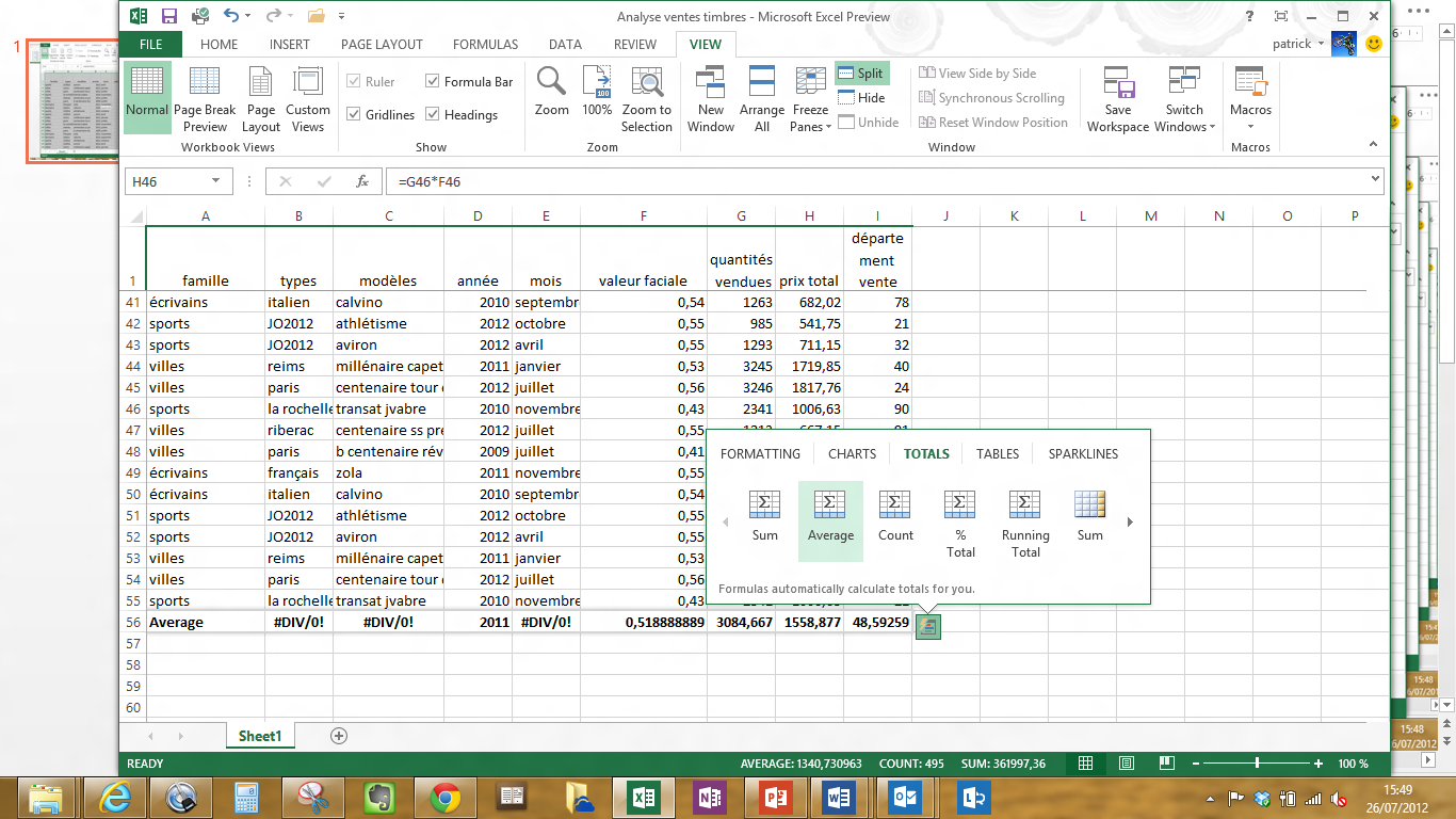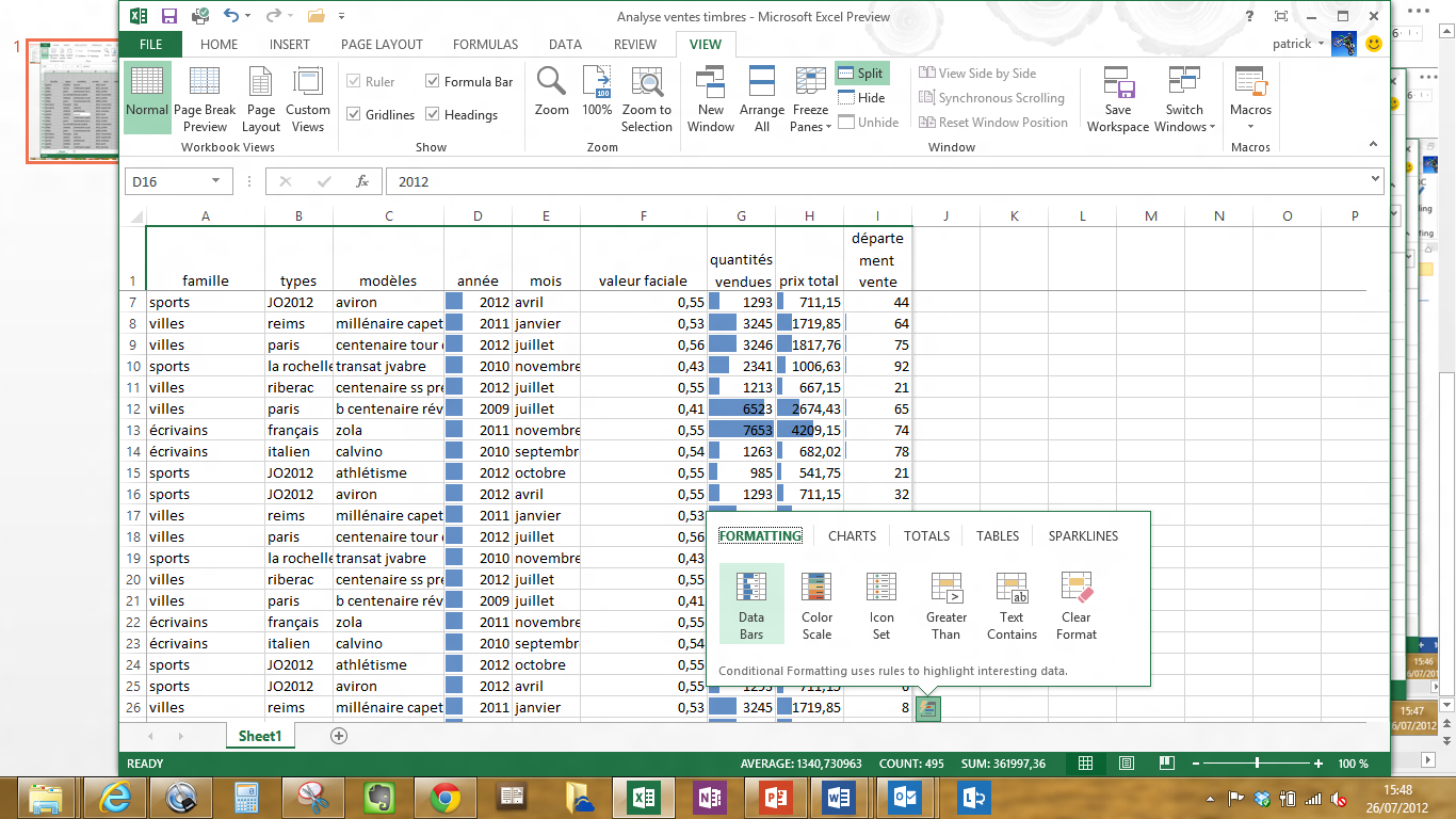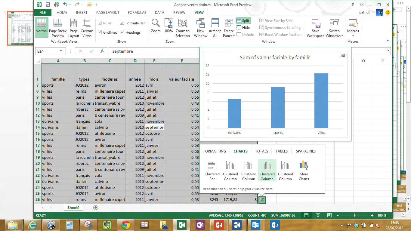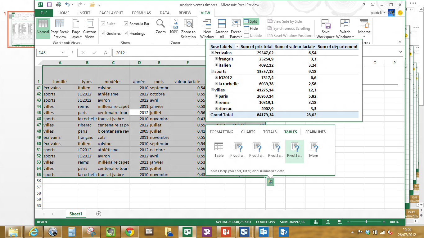 J’ai pour l’occasion créé un fichier Excel qui contient une base de données de suivi de ventes de timbres poste (ci-dessous) et sur laquelle je vais poursuivre quelques analyses.