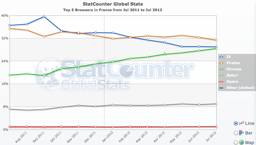 Statcounter a publié ses statistiques pour juillet 2012 : pour la première fois au niveau mondial Chrome passe devant IE avec plus de 34% versus 32% de parts de marché. Même écarts en Europe mais avec un Firefox qui passe aussi devant IE (respectivement 30% pour Chrome, 29% pour FireFox et 28% pour IE). En France, le navigateur de Microsoft reste en tête (une très courte tête : 0,5%) face à Chrome mais est derrière Firefox (respectivement 29%, 28,5% et 31,5%).