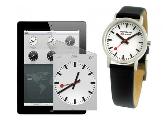SFR (Swiss Federal Railways, bien sur !) pourrait, avec son fabriquant exclusif de montres Mondaine porter plainte contre Apple qui avec iOS6 sur iPad reprend dans l’application horloge le look de ses montres et cela sans autorisation 🙂
