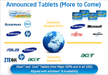 Concernant le premier axe, Intel propose aujourd’hui 2 familles de processeurs : Core et Atom. Initialement introduit en 2007/2008, les processeurs Atom visaient à proposer des solutions x86 à basse consommation et optimisées pour les appareils de petites tailles (Netbooks et produits embarqués industriels au départ). Depuis ces premières versions, la famille Atom a beaucoup évolué et constitue aujourd’hui la plateforme Intel de choix pour certaines tablettes à faible poids (600 à 700 grammes), faible consommation, et plus grande autonomie (10 heures). En session, un intervenant Intel a fait circuler sa tablette, non commerciale, un prototype (Design Reference) basé sur un de ces nouveaux processeurs Atom, qui offre effectivement des arguments positifs (faible poids, peu de chaleur dégagée, et capacité à faire tourner les logiciels x86) très séduisants. Les solutions Atom équipent aussi aujourd’hui les premiers smartphones d’architecture Intel, dont la diffusion reste encore assez limitée (6 modèles existent aujourd’hui au niveau mondial, après une première disponibilité récente, en juin 2012). C’est sur le secteur des tablettes sous Windows 8 que les nouveaux processeurs Atom vont apparaitre en nombre dans les mois à venir (voir image ci-contre, source Intel).