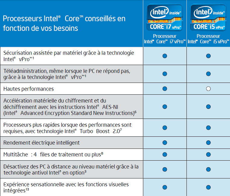 Intel poursuit depuis de nombreuses années une stratégie d’intégration dans le silicium de fonctions avancées liées à la sécurité, l’administrabilité… Fournie sous la marque Intel vPro, Intel propose une collection de technologies pour supporter de nombreuses fonctions (contrôle, maintenance, inventaire, gestion, sécurité). Le tableau ci-dessous décrit les principales caractéristiques des processeurs vPro de 2ème génération, actuellement disponible. A noter vPro évoluera également en 2013, pour proposer de nouvelles fonctions, selon la plateforme matérielle concernée.