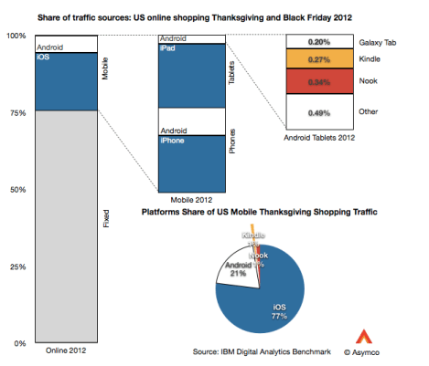Si la domination de la plateforme Androïd sur le marché de la mobilité (en fait celui des téléphones, car pour les tablettes les choses ne sont pas aussi tranchées), avec près de 75% de part de marché sur le parc installé, pour seulement 15% à l’iPhone, un point reste encore en faveur (et largement) d’iOS : l’activité en ligne des possesseurs d’iPhone. C’est ce que viennent encore confirmé les chiffres de vente du Black Friday, tels que publiés par IBM, dans son enquête Digital Analytics Benchmark. Il apparaît que les ventes en ligne à l’occasion de ce Black Friday ont augmenté de 17,4% et que les ventes réalisées à partir de plateformes mobiles pèsent maintenant 24% du total des ventes.