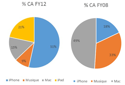 Apple est aujourd’hui un géant dont le mix de chiffre d’affaires a beaucoup évolué ces dernières années sous le raz de marée de l’explosion de son CA (pour mémoire sur son année fiscale 2008, Apple avait généré un CA de 32,8 milliards de dollars) :