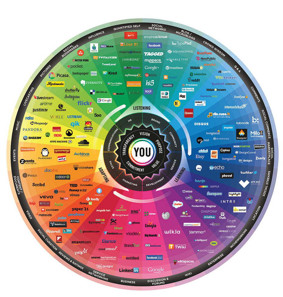 Depuis 2008, Brian Solis réalise une cartographie appelée « prisme de la conversation » : il s’agit d’une infographie très bien faite du paysage des médias sociaux. Cette 4ème édition est franchement très riche et intègre les différents moyens de communication en fonction des cibles.