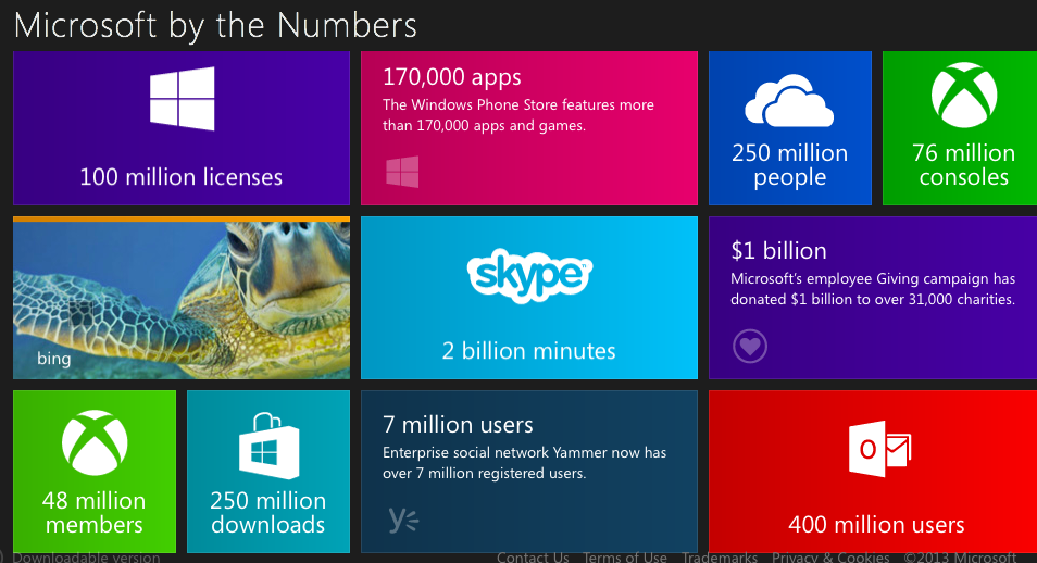 Microsoft vient de mettre en ligne un site sous le look Modern UI reprenant une série de chiffres clés (et forcément élogieux) sur la société, ses produits et les services qu’elle met à disposition.