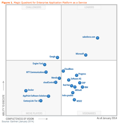 Gartner vient de publier sont nouveau Magic Quadrant pour le PaaS (Plateforme as a Services). En tête Salesforce, société qui rappelons-le avait lancé le SaaS dans les entreprises et Microsoft avec bien entendu Azure.