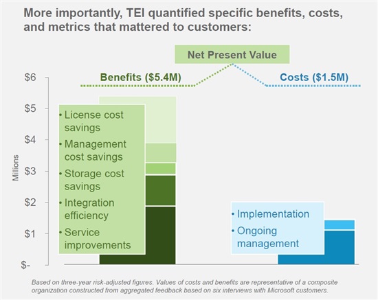 Cette étude réalisée à la demande de Microsoft conclut à un ROI de 270%, avec une période de Payback de 5 mois et présente une étude de cas d’une entreprise ayant obtenu une Net Present Value (NPV) de près de 4 millions de dollars liée à ce choix.