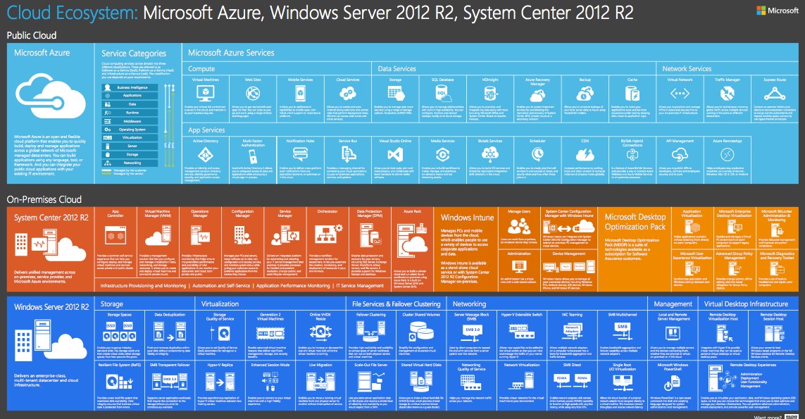 Microsoft a publié un poster détaillant son écosystème Cloud. Ce poster présente toutes les technologies Microsoft Azure, Windows Server 2012 R2 et System Center 2012 R2 relatives aux approche IaaS / PaaS dans des contextes de Cloud public, privé ou hybride.