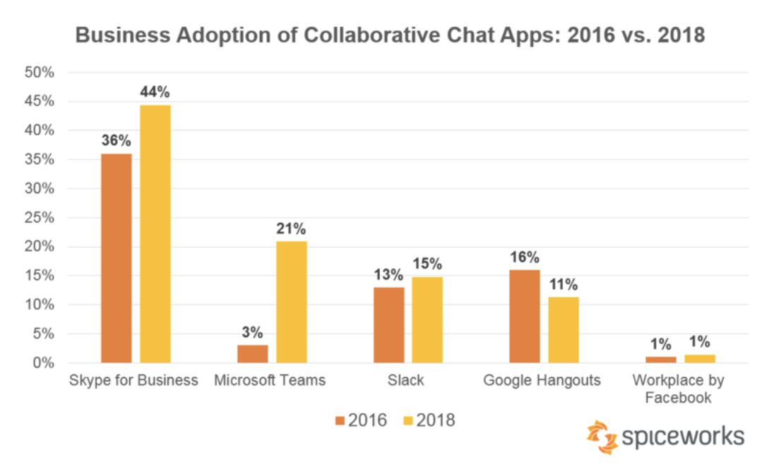 Microsoft Teams a été dès son introduction (annonce novembre 2016) présenté comme une application « Slack Killer », après que la rumeur de rachat de Slack par Microsoft se soit éteinte. Qu’en est-il 2 ans après ? C’est une des questions à laquelle l’étude publiée par Spiceworks tente de répondre concernant les usages de chat.