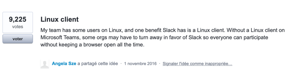 Cette rumeur est née d’une réponse postée sur un site de forum UserVoice qui rassemble des feedbacks et demandes d’utilisateurs (actuels et potentiels) sur Microsoft Teams à destination des équipes produits chez Microsoft. Sur ce forum, la demande initiale date des débuts de Teams (novembre 2016) et n’avait pas connu de réponse. Pourtant cette demande était supporté par près de 10 000 personnes, représentant jusqu’au début du mois d’aout 2019, ou Alex (membre de l »équipe engineering de Teams chez Microsoft) a posté une réponse qui a suscité l’émoi (plus de 1200 commentaires en quelques jours) : « Nous savons que vous êtes nombreux à attendre une client Teams pour Linux, et nous sommes heureux de confirmer que nous travaillons activement dessus. Restez connecté pour plus d’information« . Pas à un mot pour le moment concernant une possible date de preview/dispo pour la solution.