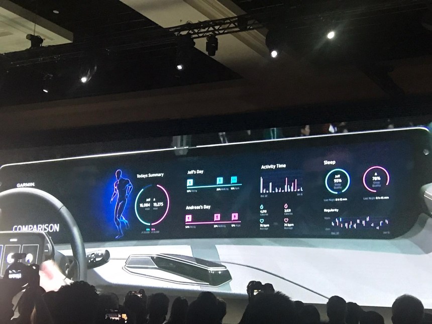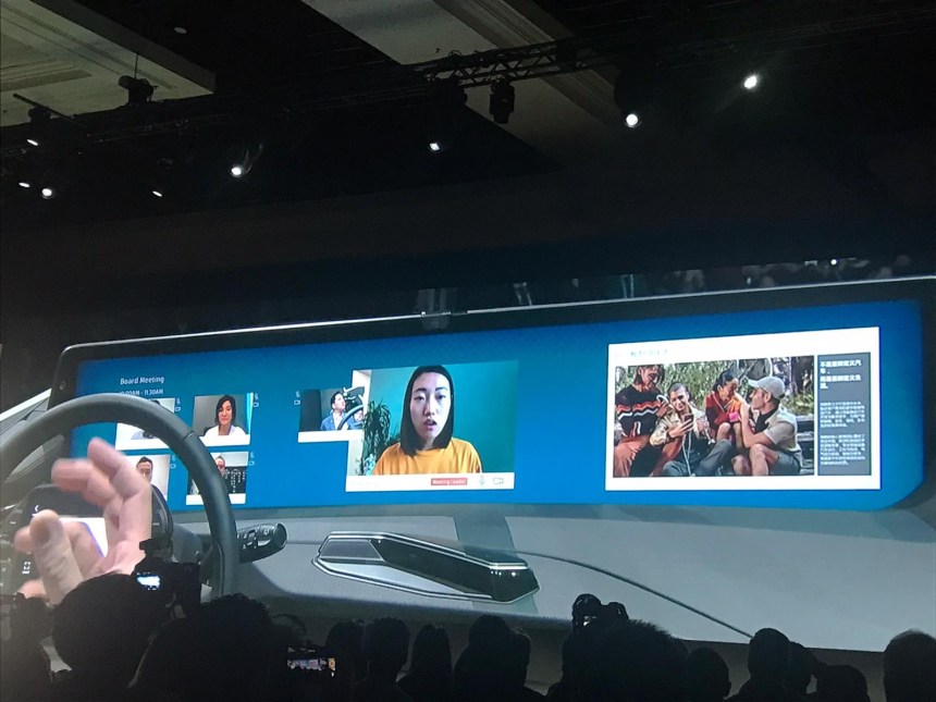 Bien plus qu’un simple tableau de bord, cet écran devrait être un support de productivité ou de détente selon Byton , avec une application de visioconférence démontrée sur scène, une application avec des indicateurs de fitness, ou encore un environnement vidéo complet (vive la sécurité routière …) :