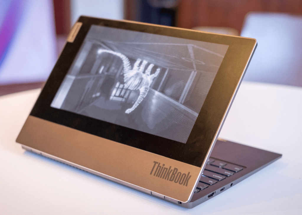 Lenovo est décidément en verve pour ce CES 2020 (voir le ThinkPad X1 Fold) en présentant un autre laptop dont la particularité est d’avoir sur la face avant un écran eInk qui permet d’afficher lorsque le PC est fermé des informations complémentaires (calendrier, pages web, livres …). Cet écran extérieur a une taille de 11 pouces (pour un écran interne de 13 pouces), il est également tactile et peut être utilisé avec le stylet pour prendre des notes et es synchroniser dans OneNote par exemple. Lorsque le PC est ouvert normalement, l’affichage sur l’écran externe est désactivé pour d’évidentes rasions de confidentialité.