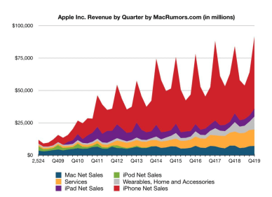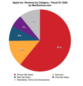 Tous les segments profitent de ce boom, et les iPhones qui représentent 61 % des ventes de ce trimestre ont permis à Apple de revendiquer plus de 1,5 milliards de terminaux actifs sur le marché à fin 2019.