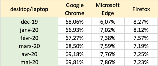 Nous en avons parlé à plusieurs reprises dans ce blog (ici, là ou encore là), depuis le début de l’année 2020 dans le domaine stratégique des navigateurs Internet, Microsoft is back. Avec une réponse cette fois ci à la hauteur des enjeux, et des ambitions de Redmond. Le navigateur de Microsoft, basé sur Chromium la souche open source du navigateur Google Chrome, continue sa progression selon le dernier relevé Net Marketshare de mai 2020. Ainsi le trio de tête sur le secteur des desktop/laptop s’établit ainsi : premier, Google Chrome avec une écrasante avance, second Microsot Edge (le nouveau, Chromium Edge) et troisième Firefox. Les 2 derniers ont échangé leurs positions en mars dernier, après le début de montée en puissance de Chromium Edge, dont la première release disponible ne date que de janvier 2020.