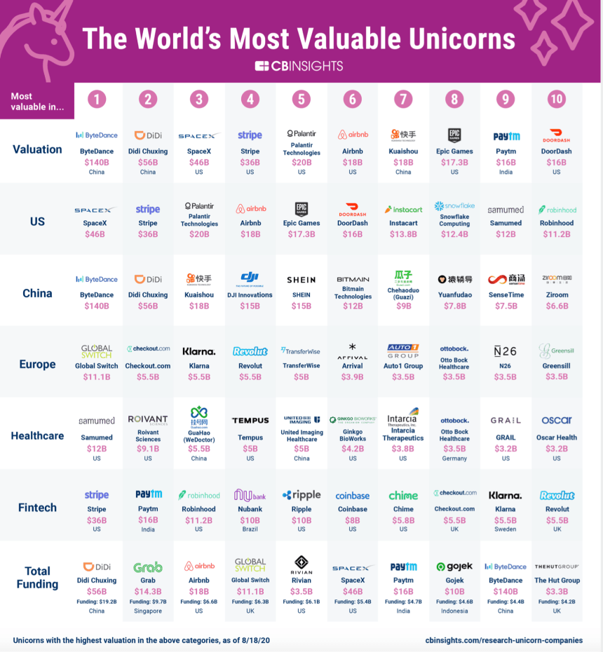 De même en termes de valorisation, 9 des 10 premiers sont américains et chinois, avec sur les 2 premières marches du podium 2 chinois (ByteDance valorisée 140 milliards de dollars !!) et Didi Chuxing (domaine de l’automobile et des transports, valorisée 56 milliards). L’américain SpaceX occupe la troisième place sur le podium avec une valorisation estimée à 46 milliards de dollars.