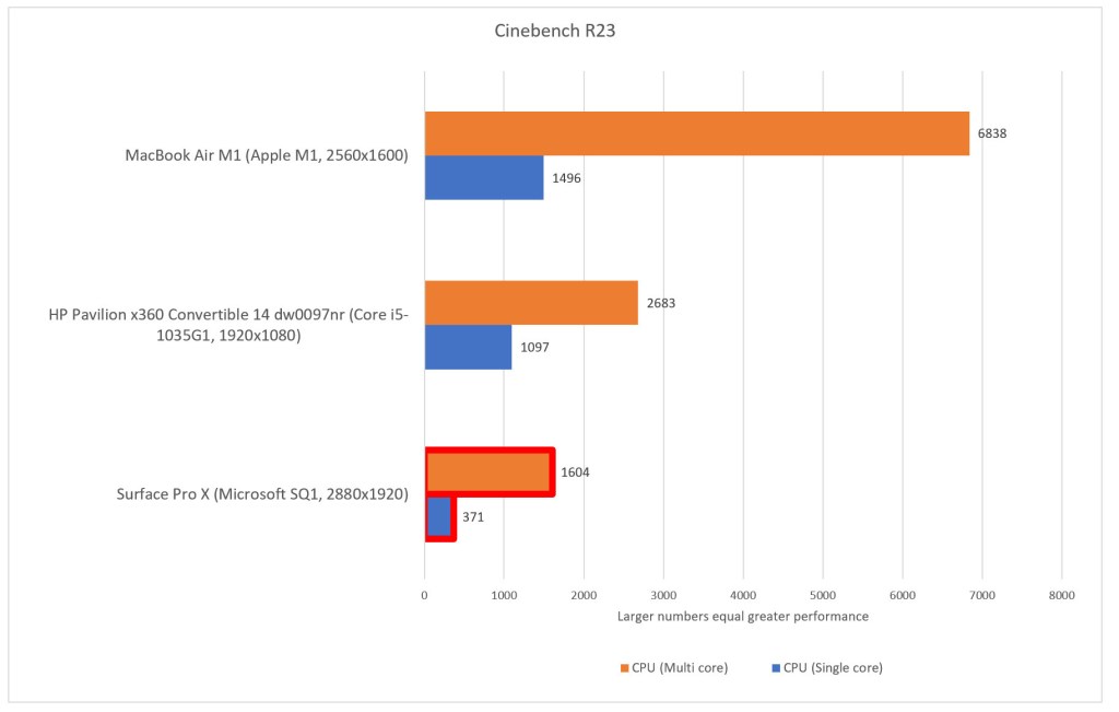 Mais PCWorld a souhaité comparer ce nouvel MacBook Air avec la Surface Pro X de Microsoft disposant elle aussi d’une puce ARM réalisée par Qualcomm en collaboration avec Microsoft. Le résultat est sans appel : la Surface Pro est loin, très loin derrière le Macbook. Alors même que ce dernier dispose de plus d’applications natives (dont Office 365 !!), une meilleure connectique (Wifi 6, USB 4) tout en coutant moins cher (20% environ à capacité SSD équivalente…