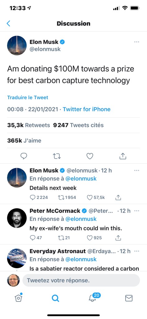 Après être devenu l’homme le plus riche du monde le 7 janvier dernier délogeant , avec 185 milliards de dollars, Jeff Bezos, E.Musk vient d’annoncer par un tweet hier (çà me rappelle quelqu’un !) qu’il donnait 100 millions de dollars pour la meilleure technologie de capture du carbone.