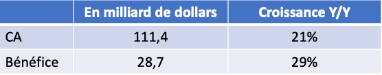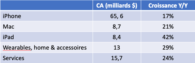 Ce dernier trimestre de l’année est toujours pour Apple signe de ventes importantes, fêtes de Noël obligent, mais cette année la conjonction des nouveaux produits (iPhone 12, Macbook M1, AirPods Max …), de Noël et des impacts de la crise COVID 19 sur l’explosion du travail à domicile ont créé un effet booster à l’activité de l’entreprise.