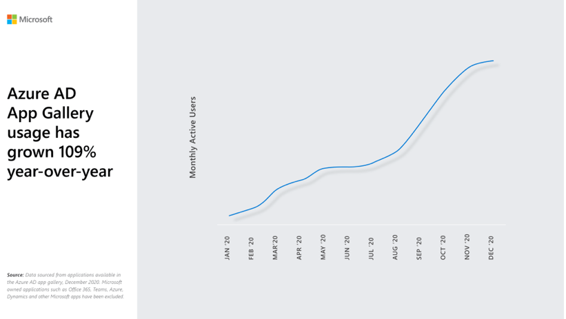 Parmi les enseignements de ce rapport, sans surprise tout d’abord, le niveau global d’usage d’Azure AD a connu une croissance continue au cours de l’année 2020, avec le développement du travail à distance et le recours de plus en plus large à des ressources cloud dans les entreprises.