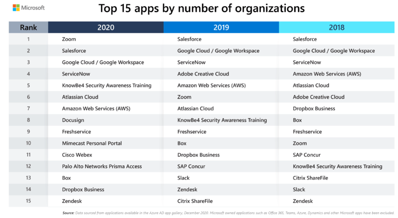 ServiceNow reste numéro en nombre de MAU, et ce depuis 3 ans, devançant en 2020 Google Cloud. Si l’on regarde le classement par nombre d’entreprises utilisatrices, c’est Zoom qui figure en tête de liste des applications non Microsoft ayant eu recours à Azure AD, signalant l’adoption de la solution de visioconférence dans cette période particulière.