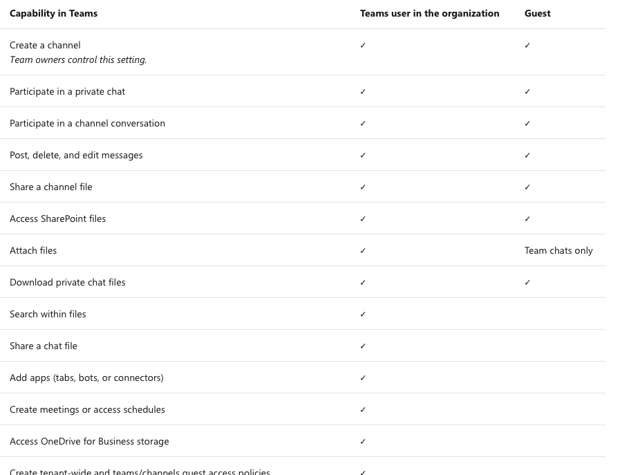 En termes de capacités offertes à ces utilisateurs externes, Microsoft propose un tableau comparatif entre les invités et les membres d’équipes. Si les invités peuvent participer aux conversations privées et dans les channels, partager des fichiers dans un channel ou accèder à des fichiers SharePoint, ils ne peuvent pas (entre autres) accèder à OneDrive (et donc pas visualiser les vidéos des réunions enregistrées, même si dans la conversation il est indiqué que la vidéo est disponible), partager un fichier dans une conversation ….