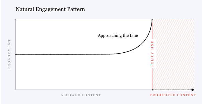 Par ailleurs, dans sa note A Blueprint for Content Governance and Enforcement, Mark Zuckerberg revient sur la capacité des réseaux sociaux à accroitre l’engagement des utilisateurs, avec du contenu « interdit », comme indiqué sur le schéma utilisé dans cette note.
