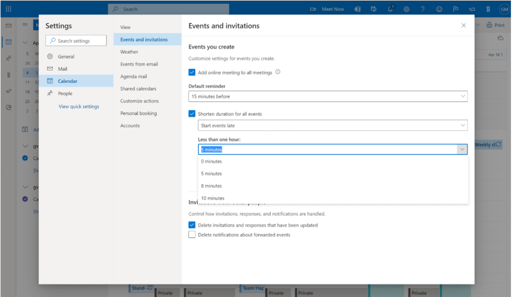 Afin d’aider à répondre à ce problème, Microsoft ajoute à Outlook une nouvelle capacité, pour réduire automatiquement la durée de chaque réunion, de manière à conserver un break entre 2 meetings. De façon concrète, il sera possible de définir au niveau de l’organisation un réglage Outlook qui réduira chaque meeting d’une durée personnalisable (5 minutes par ex pour chaque réunion d’une heure), au choix au début ou à la fin de la réunion. Ces réglages établies pour toute l’organisation pourront être modifiés au niveau individuel.