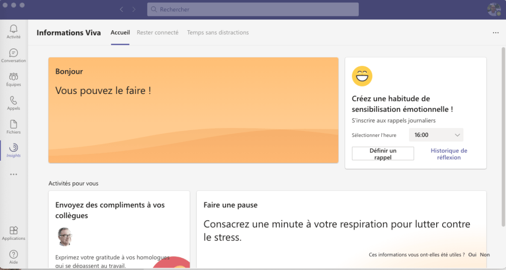 L’app Viva Insights (Viva Informations en français) qui propose un tableau de bord et de suivi d’activités individuel, est disponible en preview également. Elle consolide des infos de Teams, Outlook, SharePoint pour fournir quelques indicateurs de suivi et des recommandations.